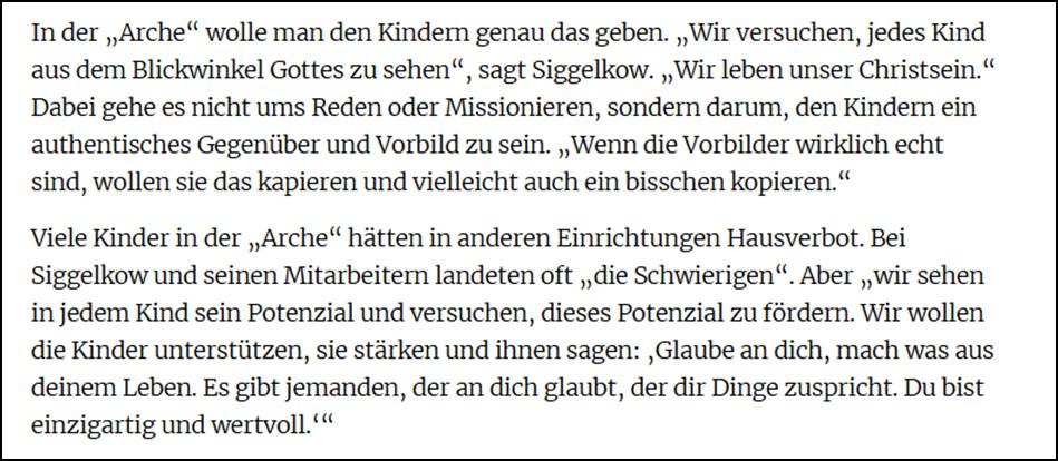 Aber auch in 2023 wurde er deutlich: „Arche-Gründer: „Mit Geld, Gebeten und Worten um unsere Kinder kämpfen[22] Zitat: „„Gerade wir Christen müssen jetzt aufstehen und mit Geld, Gebeten und Worten um unsere Kinder kämpfen“, erklärt Siggelkow auf PRO-Anfrage, und weiter: „Wir brauchen starke Kinder, um unsere Zukunft zu meistern.“