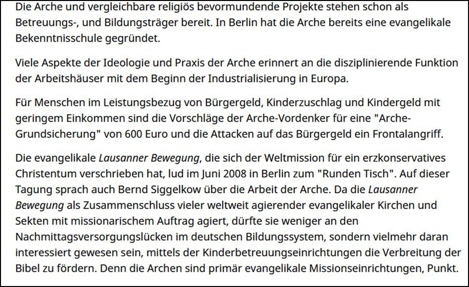 Doch lesen Sie selbt! archive.is/r8nR7 Hier wird erstmals erwähnt, dass Die Arche in Berlin eine evangelikale Bekenntnisschule gegründet hat. In diesem Artikel werden Die Arche als „primär evangelikale Missionseinrichtungen, Punkt“ bezeichnet.